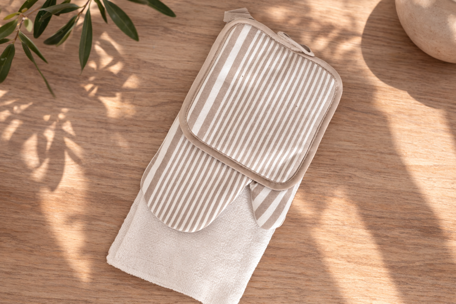 El set está compuesto de repasador, agarradera y manopla. Estilo y comodidad en tu cocina