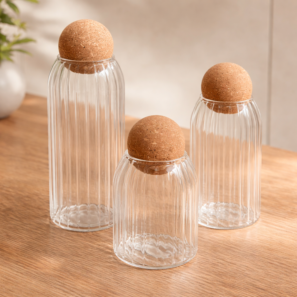 Recipiente facetado de vidrio con tapa de corcho natural para almacenar ingredientes o elementos de uso diario.