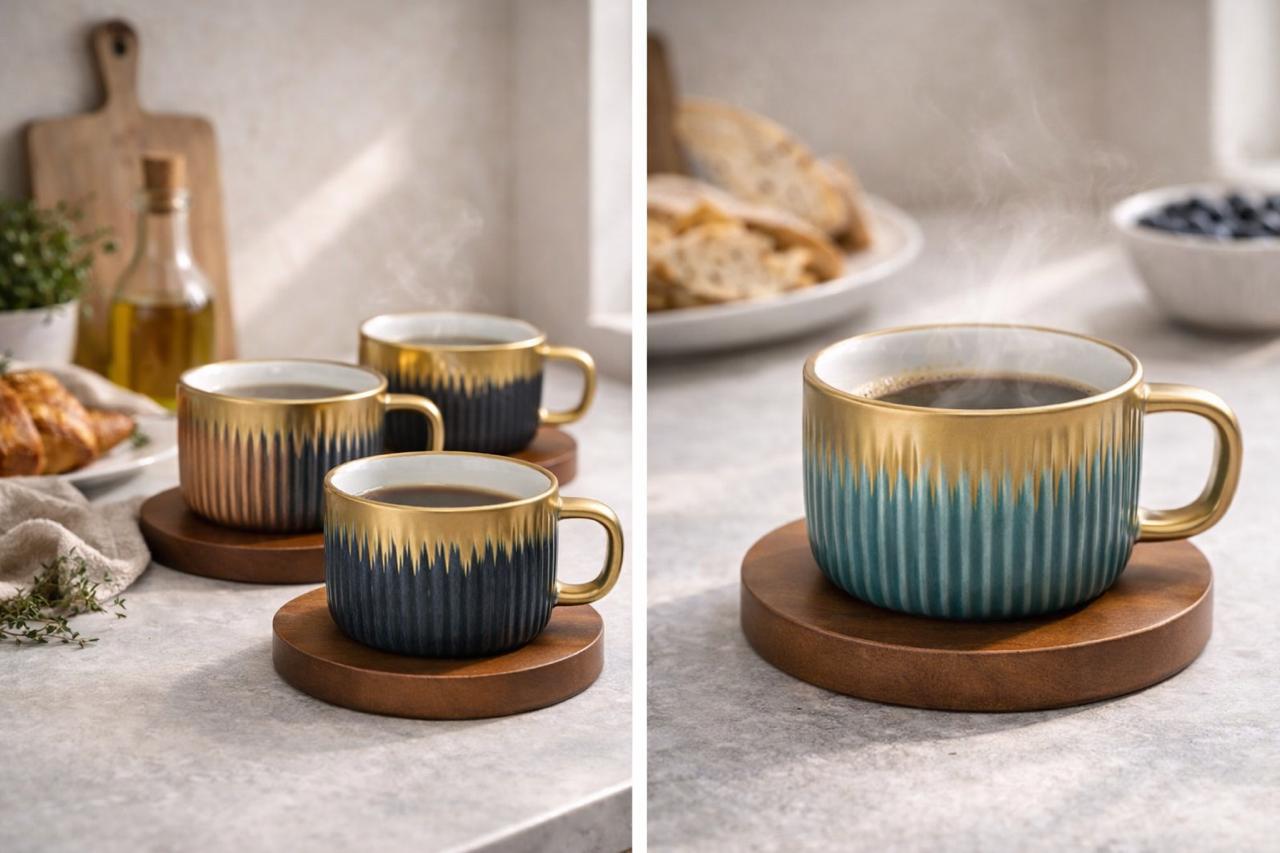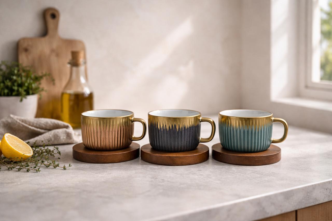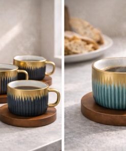 Acompaña infusiones o café con un acabado cálido y envolvente. Su degradé evoca la madera al sol sobre la mesa.